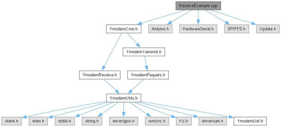 This code is an example of how to use the Ymodem library to receive a file using the Ymodem protocol. The file is received through the Serial1 port and saved to the SPIFFS filesystem.